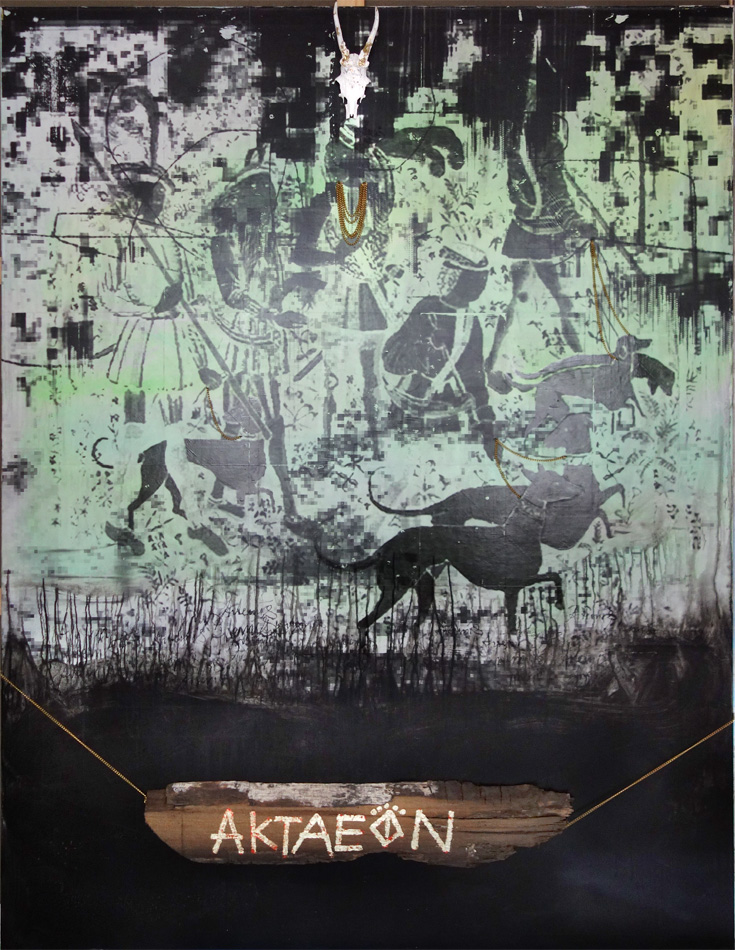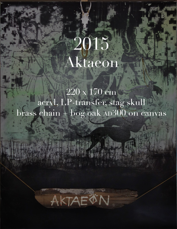 2015 // Aktaeon // 220 x 170 cm // acryl, LP-transfer, stag skull, brass chain + bog oak AD 300 on canvas |