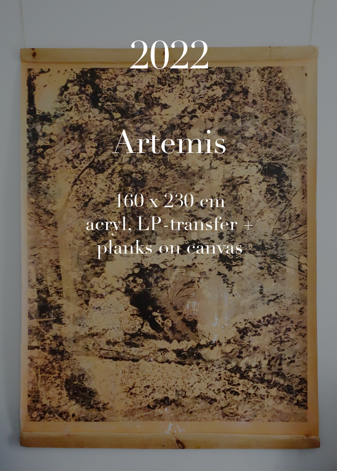 2022 // Artemis // ca. 220 x 155 cm // acryl, LP-transfer, planks on canvas |